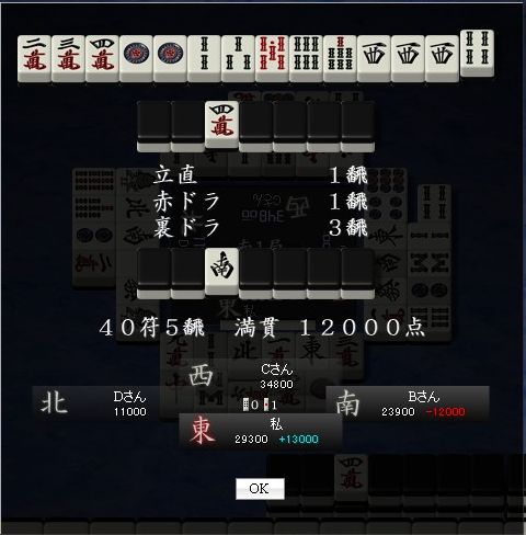 途中で四暗刻のイーシャンテン状態まで持っていけたんですが、やはりなにより上がることが目標。